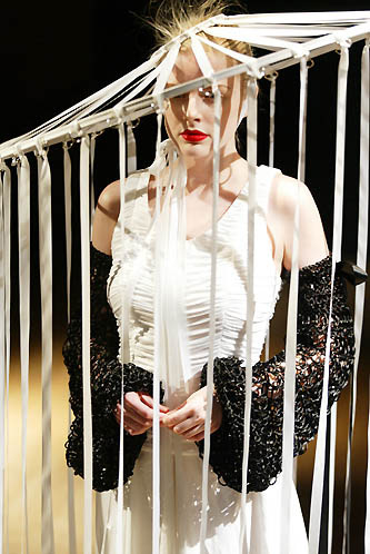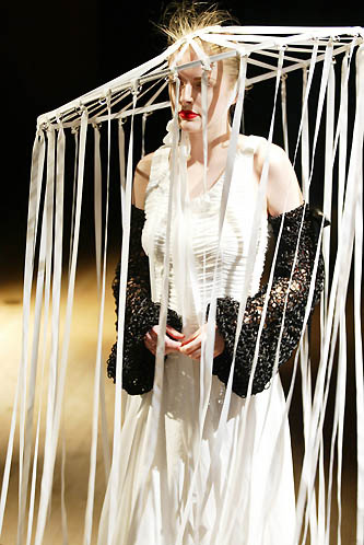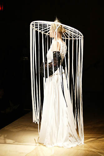 One-of-a-kind hand-crocheted blouson ribbon sleevelets by Annie Ok for Benjamin Cho: Fall 2002 Collection, during which season Ok was guest contributing artist.
